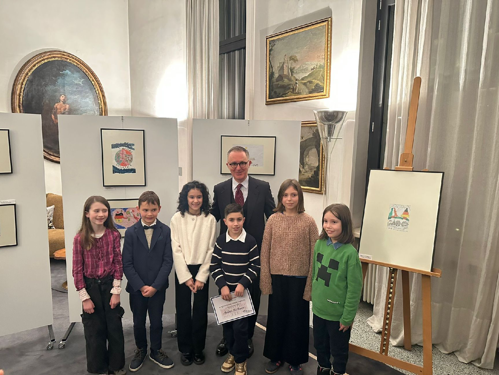 Die Zeichnung von Roberto De Franco aus der Klasse 3b der Leonardo-da-Vinci-Grundschule wurde mit dem ersten Preis des Wettbewerbs „Eine Weihnachtskarte für die Botschaft: Ein Wunsch, der verbindet!“ ausgezeichnet. Seine Karte mit dem Titel „Die Reise des Glücks“ („Il viaggio della fortuna“) zeigt einen Zug voller lächelnder Menschen und steht symbolisch für die enge Verbundenheit zwischen Italien und Deutschland. Sie ist zugleich eine Hommage an die vielen Italienerinnen und Italiener, die seit Generationen die Beziehungen und die Freundschaft zwischen beiden Ländern prägen. Am Dienstag, den 9. Dezember, wurde Roberto persönlich vom italienischen Botschafter geehrt. Mehr als zweihundert Werke wurden für den Wettbewerb eingereicht. Die Teilnehmerinnen und Teilnehmer – Schülerinnen und Schüler unterschiedlicher Schulformen und Jahrgangsstufen aus ganz Deutschland – beeindruckten mit großer Kreativität und Engagement. Robertos Karte wird in diesem Jahr als offizielle Weihnachtskarte der italienischen Botschaft und des gesamten Konsularnetzes verwendet. Wir sind sehr stolz auf unseren Schüler sowie auf alle Kinder, die an diesem Wettbewerb teilgenommen haben.