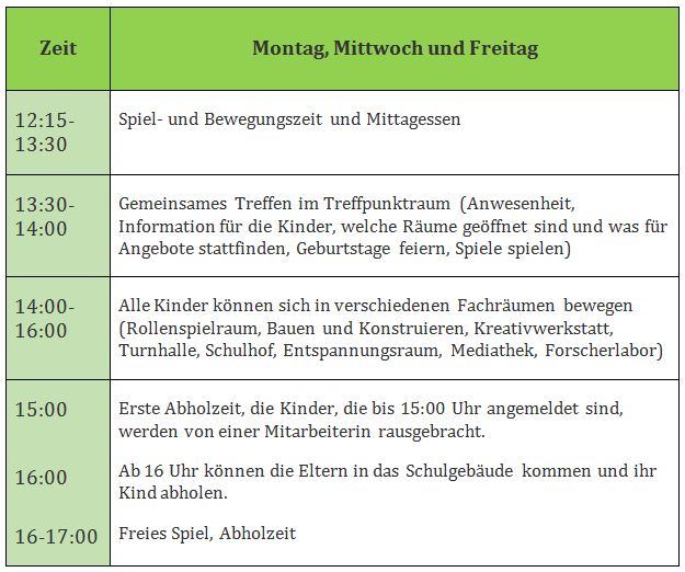 Alle Kinder bestimmen ihren Tagesablauf mit, indem sie sich eigenverantwortlich und weitestgehend selbstbestimmt in den Angeboten bewegen, die in den zeitlichen Korridoren angeboten und genutzt werden können. Die Kinder sind gemeinsam mit ihrer Stammgruppenleitung ihres Moduls und zwei weiteren pädagogischen Fachkräften um 13:30 Uhr in ihrem Treffepunktraum. Dort erfahren sie, welche Fachräume und Angebote am jeweiligen Tag stattfinden und welche pädagogische Fachkraft diesen Raum öffnet. Die Kinder feiern Geburtstage, spielen Spiele und besprechen anstehendes. Ab 14 Uhr können sie sich dann frei nach ihren Bedürfnissen in verschiedenen Fachräumen und Angeboten bewegen. Um 15 Uhr ist die erste Abholzeit, die Kinder, die noch im Ganztag sind, können sich weiter in den Räumen bewegen. Um 15:45 Uhr gibt es dann noch einen Abschlusskreis, wieder gemeinsam mit der Stammgruppenleitung im eigenen Modul. Hier kann noch einmal über Erlebtes gesprochen werden, es findet noch ein Abschlusslied oder Spiel statt.