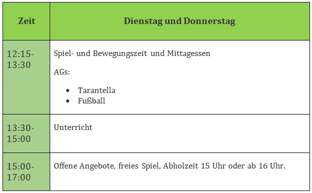 Jeden Tag in der Zeit von 12.15-13.45 Uhr haben die Kinder viele verschiedene Möglichkeiten, um ihre freie Zeit zu gestalten. Ob in der Turnhalle, im Kreativraum, in der Mediathek oder auch auf dem Schulhof und im Spieleraum, es wird wechselnde Angebote geben, die die Kinder je nach Bedürfnissen auswählen können. In dieser Zeit wird auch in der Mensa das Mittagessen angeboten.
